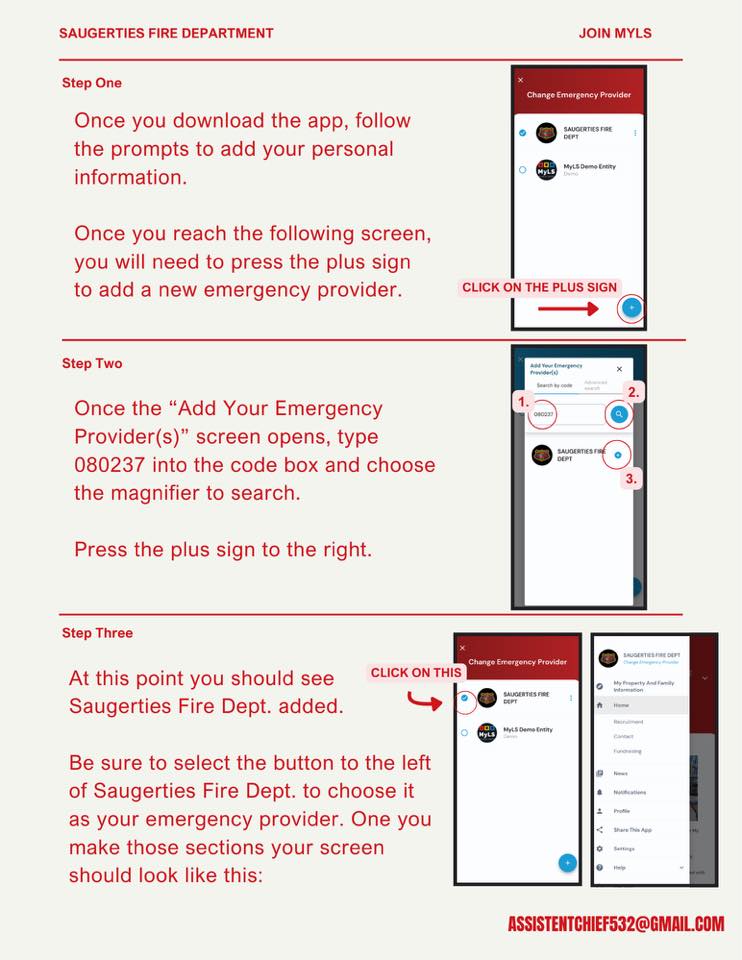 The following instructions are for anyone who has installed the MyLS app on their Apple or Android phone, and who needs to now add the Saugerties Fire Department as an entry to the app (to make it useful in Saugerties).